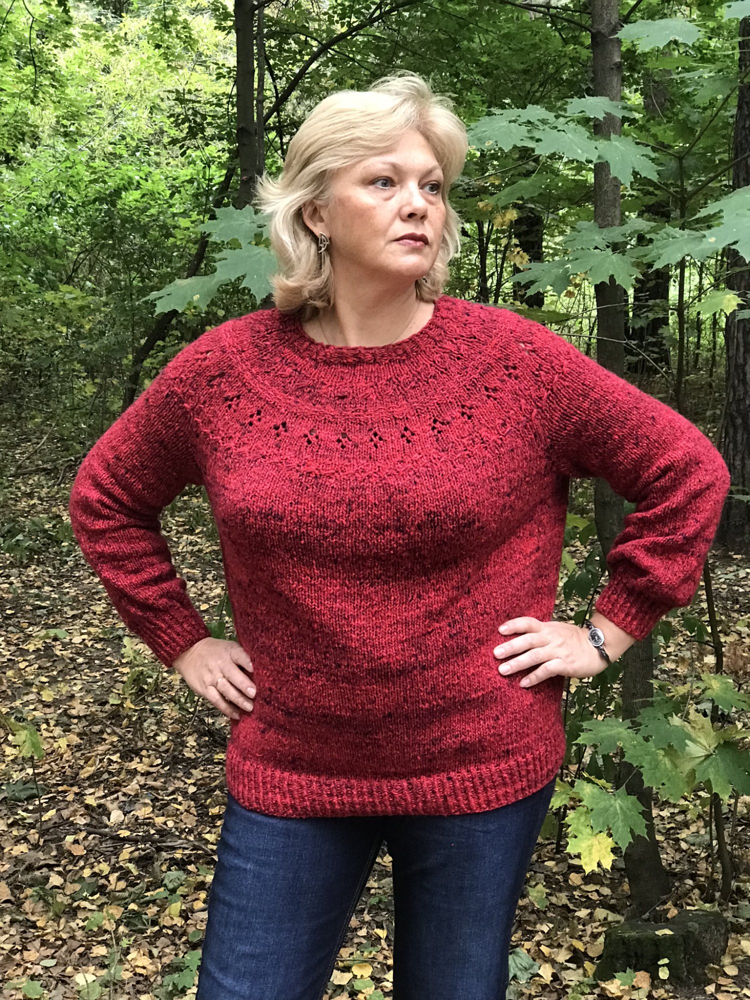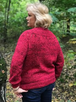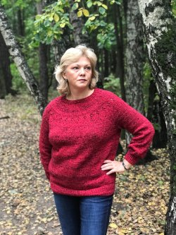 По описанию: внесены небольшие изменения по описанию кокетки, добавлены несколько рядов, выполнена горизонтальная вытачка, увеличена ширина подреза, изменены длина рукава и самого пуловера. Оригинальное описание дано в одном размере, вязала без пересчета, на мой размер ОГ116 - село так, как мне нравится.