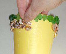 5. Прижимайте пальцам декор до полного высыхания клея. Особенно будьте аккуратны, приклеивая ракушки у основания донышка. Следите за тем, что бы они не выходили за край, иначе стаканчик будет стоять не ровно.