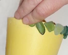 3. На верхнюю часть приклейте один ряд камушков или обкатанные волной осколки бутылочного стекла. Капнув клей на поверхность стаканчика, приклеивайте по одному камушку, крепко прижимая его несколько секунд.