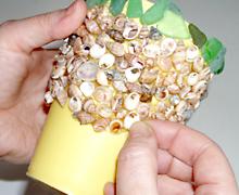 4. Затем, прикрепите маленькие ракушки. Нанесите суперклей на небольшую поверхность стаканчика и распределите ракушки, так чтобы они плотно прилегали друг к другу. Клея кладите довольно много, неровная поверхность ракушек как бы утопает в нем.
