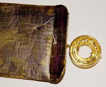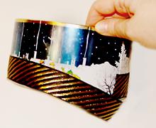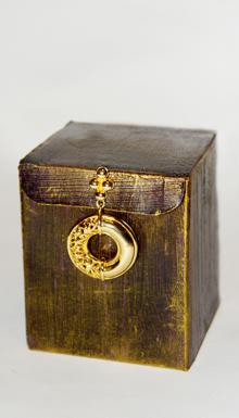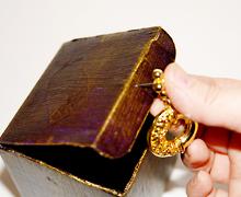 5. Крупную сережку золотого цвета прикрепите на крышку коробочки. Если эта сережка - "гвоздик", то проткните ею картон, с обратной стороны загните плоскогубцами, закрепив скотчем.