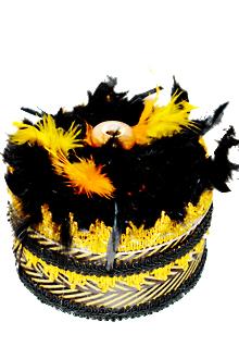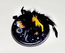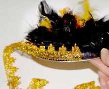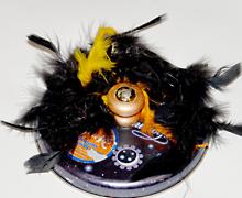 4. На крышку, в хаотичном порядке, приклейте перышки. Перья не обязательно должны быть цветными, вполне подойдут серые или пестрые, например, от старой метелки для пыли или подушки.
