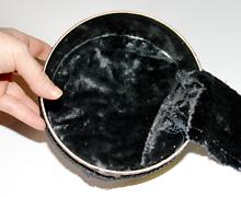 7. Внутреннюю часть коробки тоже нельзя оставлять без отделки, так как она жестяная, а для шкатулки такая поверхность не годится. Возьмите кусочек любой плотной ткани (фланель, плюш, бархат, велюр) и вырежьте круг, размером меньше крышки на 1-1, 5см.