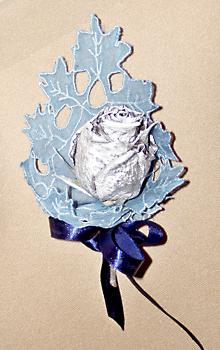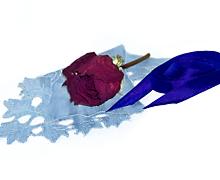 Для изготовления бутоньерки вам понадобится засушенная роза (когда начнет увядать живая роза, подвесьте ее бутоном вниз), половинка бабушкиного кружевного воротничка или обычная полоска шитья, аэрозольная краска и яркая ленточка.
