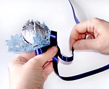 2. Заверните его в кусочек кружева и закрепите ниткой. Концы атласной ленты срежьте наискосок и оплавьте зажигалкой.