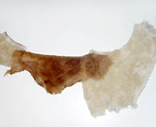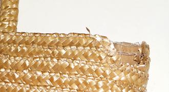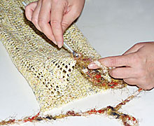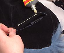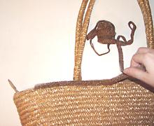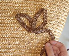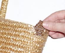 1. Небольшие отрезки тесьмы разместите в протертом месте, между подкладкой и соломкой сумки.