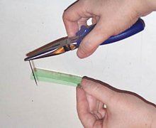 1. Срежьте горлышко с бутылки. Если пластик тонкий, воспользуйтесь ножницами, если достаточно толстый, придется пилить ножовкой. Срез не обязательно должен быть ровным, срежьте, как придется, и зачистите его шкуркой.
