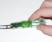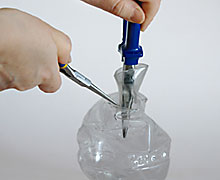 2. Затем обработайте бутылку кипятком. Для этого поставьте ее в раковину и приготовьте два инструмента для придания будущей вазе формы.В данном случае взяты две пары плоскогубцев, но можно обойтись, например, двумя вилками. Придерживая бутылку плоскогубцами за горлышко, аккуратно наливайте в нее кипяток, при этом она на время размякнет. Вторыми плоскогубцами формируйте на бутылке вмятины, одновременно прижимая бутылку ко дну раковины, что бы донышко вазы оставалось устойчивым.