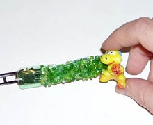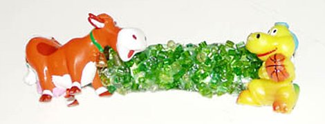 4. Бисер должен густо покрывать поверхность заколки, имитируя траву. Осталось приклеить по бокам фигурки зверей, и заколка готова!