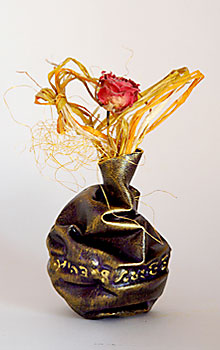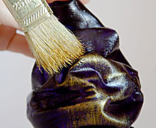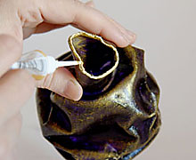 6. Сухой кистью нанесите золотую краску на поверхность вазы. Для этого, возьмите на сухую кисть немного краски и сделайте несколько мазков по бумаге или газете, пока на кисте почти ничего не останется. Такой кистью проводите по выпуклым поверхностям вазы, как бы вытирая ее о ребра вазы.