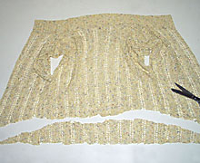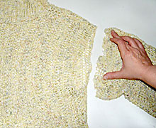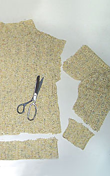 1. Отрежьте нижнюю часть свитера и рукавов (резинку), отпорите или отрежьте рукава. Затем разрежьте свитер по середине полочки и разложите его на столе, лицевой стороной вверх.